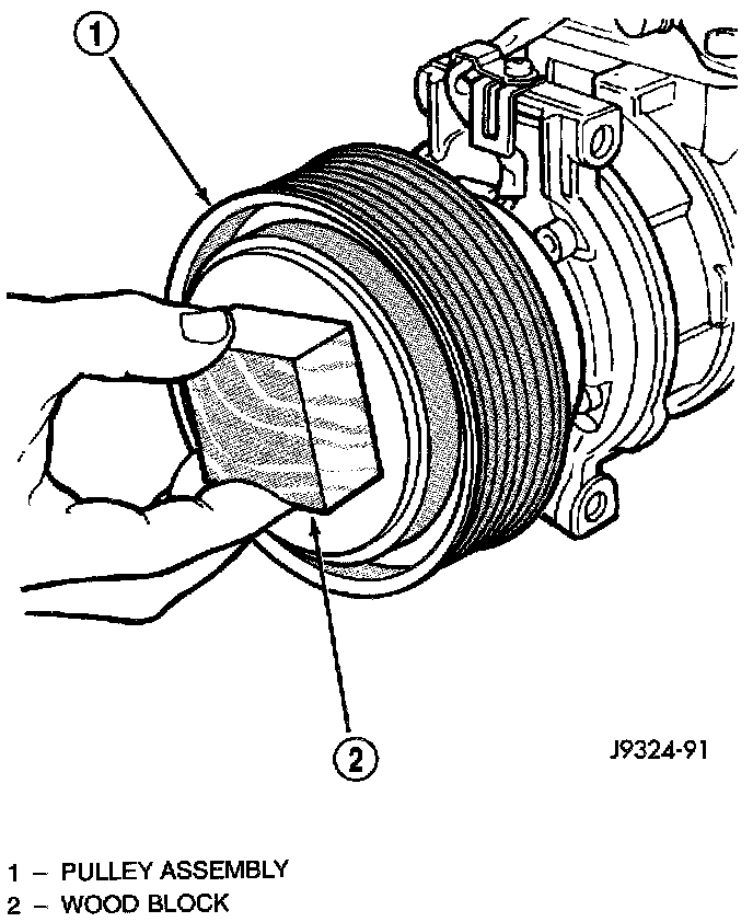 4. Install the pulley assembly onto the compressor. If necessary, place a block of wood on the friction surface and tap gently with a hammer.