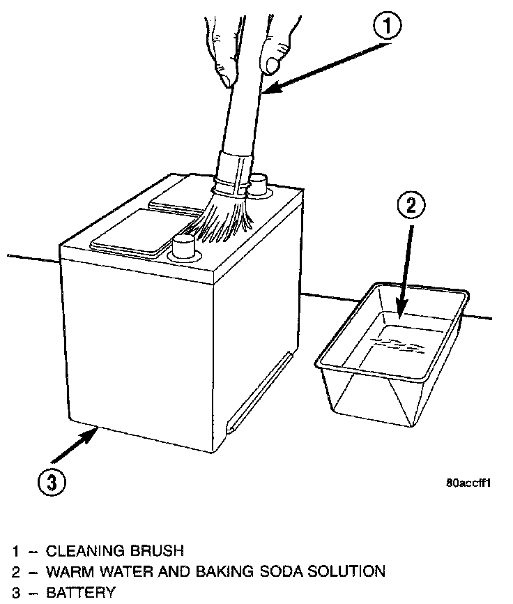 3. If the removed battery is to be reinstalled, clean the outside of the battery case and the top cover with a sodium bicarbonate (baking soda) and warm water cleaning solution using a stiff bristle parts cleaning brush to remove any acid film. Confirm that the replacement battery is the correct size and has the correct ratings for the vehicle.