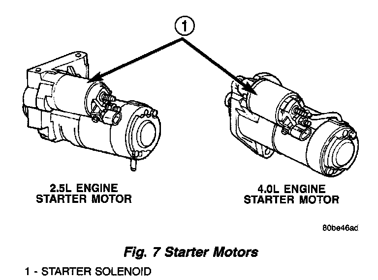 The starter motors used for both the 2.5L and the 4.0L engines available in this model are not inter-changeable (Fig. 7). However, each of these starter motors incorporates several of the same features to create a reliable, efficient, compact, lightweight and powerful unit. Both starters feature high torque direct current electric motors. Inside both starter motors the commutator of the rotating motor armature is contacted by four brushes. The starter motor for the 2.5L engine is driven by four permanent magnet field poles, while the starter motor for the 4.0L engine is driven by four electromagnetic field coils wound around four pole shoes. The 2.5L starter motor is rated at 1.2 kilowatts (about 1.6 horsepower) output at 12 volts, while the 4.0L starter motor is rated at 1.4 kilowatts (about 1.9 horsepower) output at 12 volts.