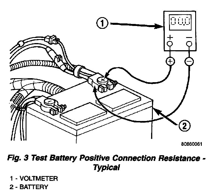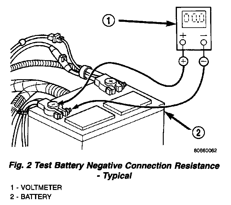 1. Connect the positive lead of the voltmeter to the battery negative terminal post. Connect the negative lead of the voltmeter to the battery negative cable terminal clamp (Fig. 2). Rotate and hold the ignition switch in the Start position. Observe the voltmeter. If voltage is detected, correct the poor contact between the battery negative cable terminal clamp and the battery negative terminal post.