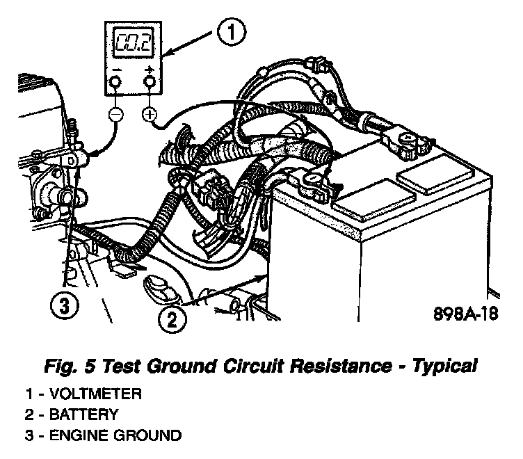 4. Connect the voltmeter to measure between the battery negative cable terminal clamp and a good clean ground on the engine block (Fig. 5). Rotate and hold the ignition switch in the Start position. Observe the voltmeter. If the reading is above 0.2 volt, clean and tighten the battery negative cable eyelet terminal connection to the engine block. Repeat the test. If the reading is still above 0.2 volt, replace the faulty battery negative cable.
