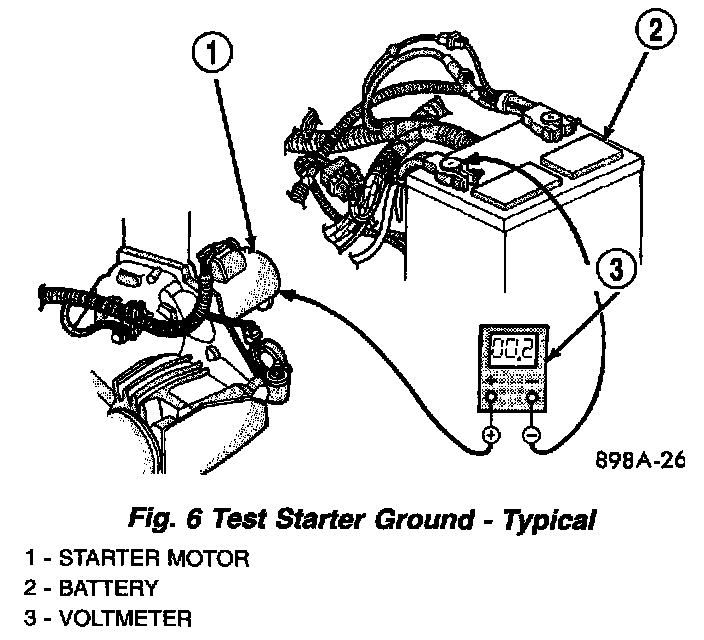 5. Connect the positive lead of the voltmeter to the starter housing. Connect the negative lead of the voltmeter to the battery negative terminal post (Fig.6). Rotate and hold the ignition switch in the Start position. Observe the voltmeter. If the reading is above 0.2 volt, correct the poor starter to engine block ground contact.