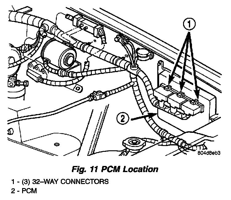 USE THE DRB SCAN TOOL TO REPROGRAM THE NEW POWERTRAIN CONTROL MODULE (PCM) WITH THE VEHICLES ORIGINAL IDENTIFICATION NUMBER (VIN) AND THE VEHICLES ORIGINAL MILEAGE. IF THIS STEP IS NOT DONE, A DIAGNOSTIC TROUBLE CODE (DTC) MAY BE SET.