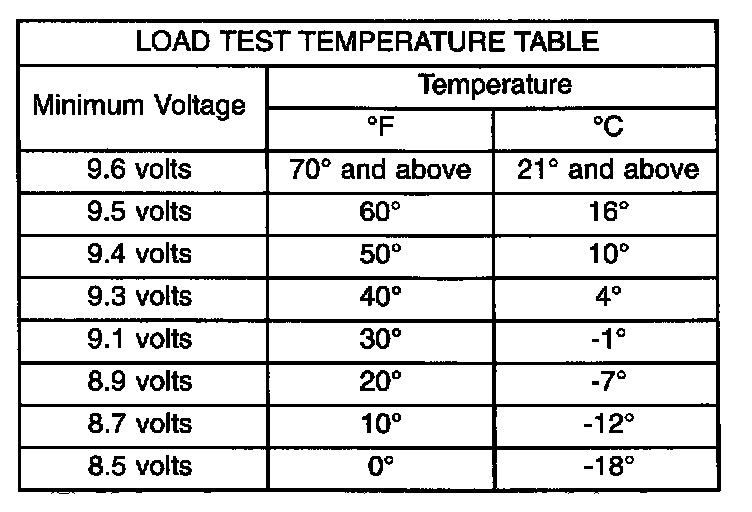 6. The voltage drop will vary with the battery temperature at the time of the load test. The battery temperature can be estimated by using the ambient temperature during the past several hours. If the battery has been charged, boosted, or loaded a few minutes prior to the test, the battery will be somewhat warmer. See the Load Test Temperature Table for the proper loaded voltage reading.