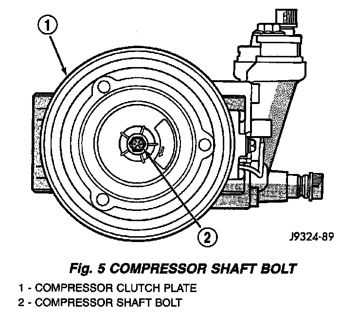 3. Remove the bolt that secures the compressor clutch to the compressor shaft. A band-type oil filter wrench may be used to secure the clutch during bolt removal.