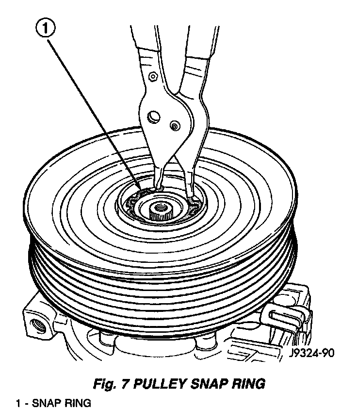 5. Remove the external snap ring that secures the compressor clutch pulley to the nose of the compressor front housing with snap ring pliers (Special Tool C-4574) and slide the pulley assembly OFF of the compressor.