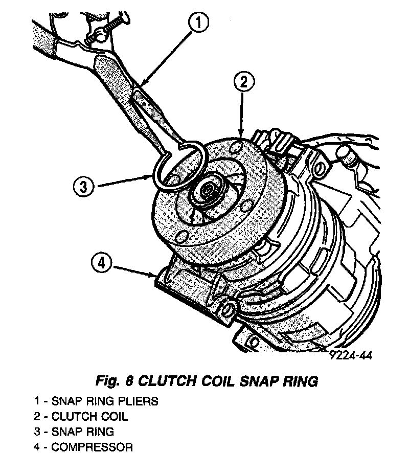 7. Remove the external snap ring that secures the compressor clutch coil to the nose of the compressor front housing with snap ring pliers and slide the coil assembly OFF of the compressor.