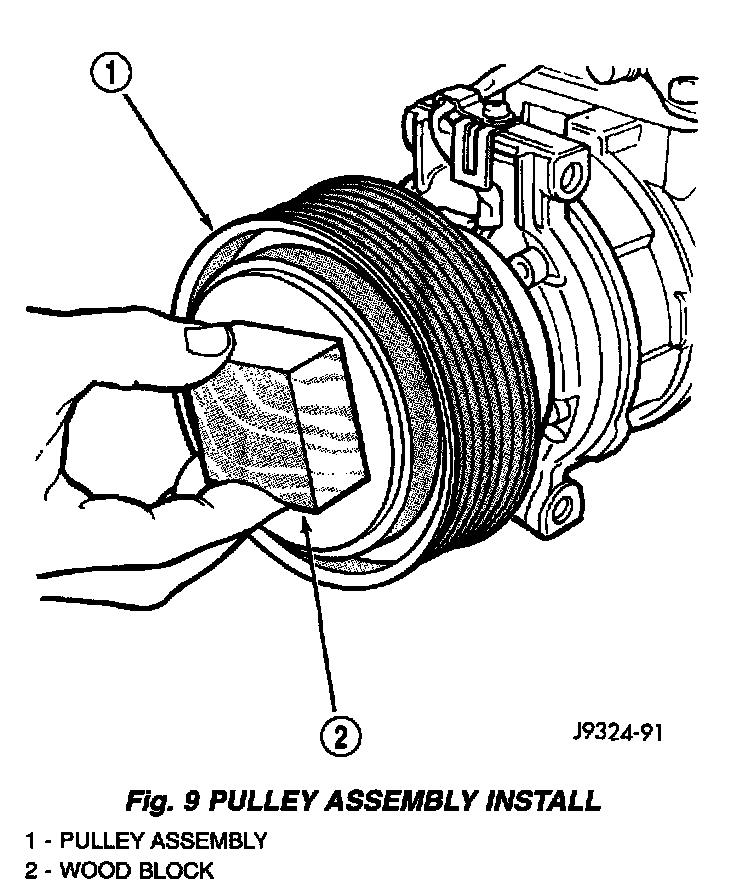 4. Install the pulley assembly onto the compressor. If necessary, place a block of wood on the friction surface and tap gently with a hammer.