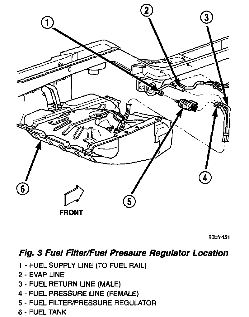 The combination fuel filter/pressure regulator is located in front of the fuel tank and above the rear axle (Fig. 3).