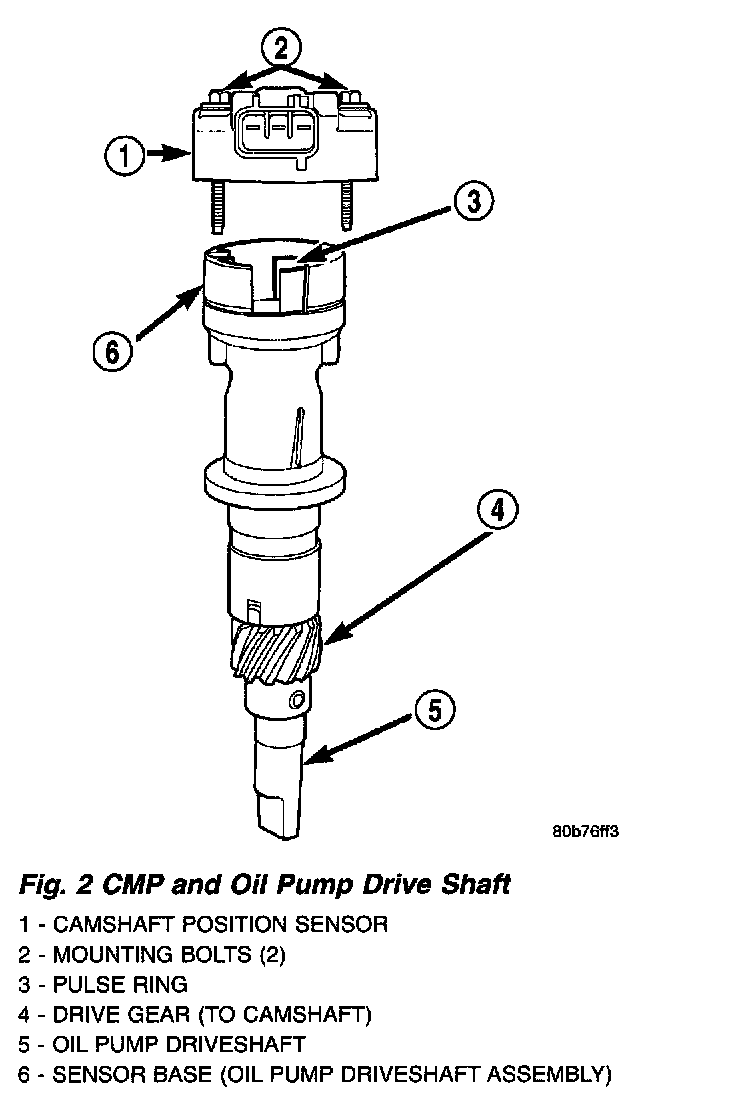 The CMP sensor contains a hall effect device called a sync signal generator to generate a fuel sync signal. This sync signal generator detects a rotating pulse ring (shutter) on the oil pump drive shaft. The pulse ring rotates 180 degrees through the sync signal generator. Its signal is used in conjunction with the crankshaft position sensor to differentiate between fuel injection and spark events. It is also used to synchronize the fuel injectors with their respective cylinders.