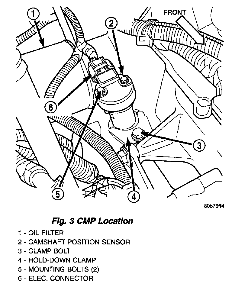 The Camshaft Position Sensor (CMP) on the 4.0L 6-cylinder engine is bolted to the top of the oil pump drive shaft assembly. The sensor and drive shaft assembly is located on the right side of the engine near the oil filter.