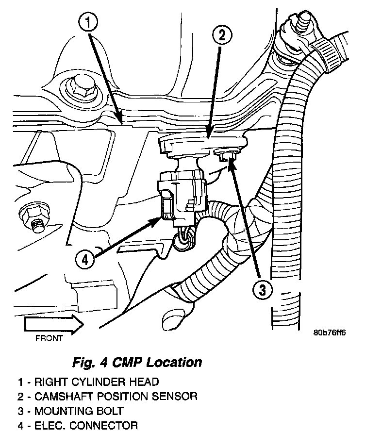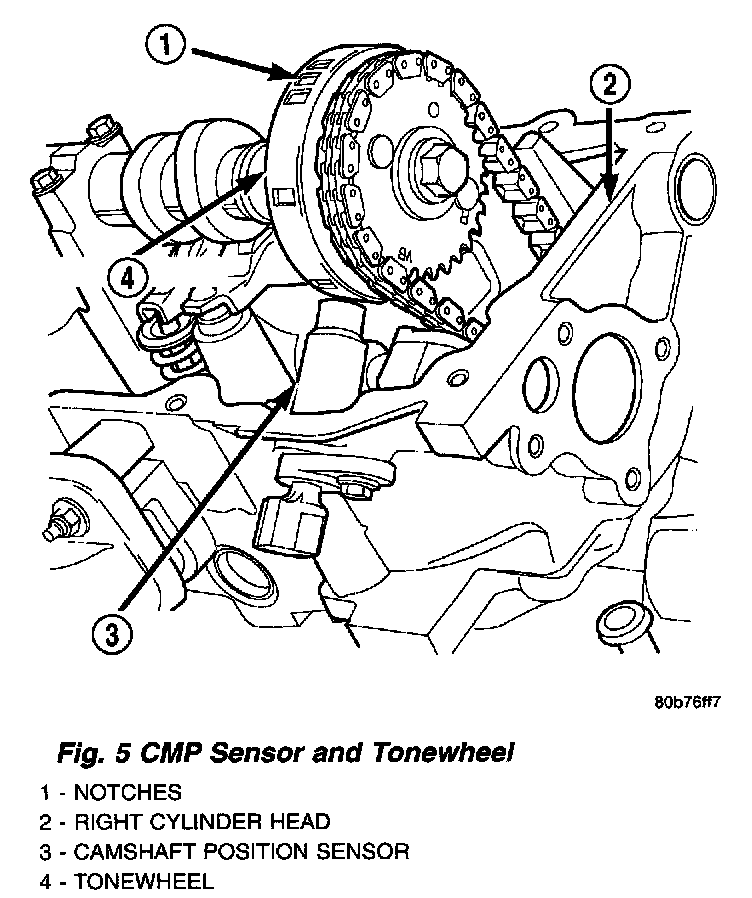 The CMP sensor contains a hall effect device called a sync signal generator to generate a fuel sync signal. This sync signal generator detects notches located on a tonewheel. The tonewheel is located at the front of the camshaft for the right cylinder head. As the tonewheel rotates, the notches pass through the sync signal generator. The pattern of the notches (viewed counter-clockwise from front of engine) is: 1 notch, 2 notches, 3 notches, 3 notches, 2 notches 1 notch, 3 notches and 1 notch. The signal from the CMP sensor is used in conjunction with the crankshaft position sensor to differentiate between fuel injection and spark events. It is also used to synchronize the fuel injectors with their respective cylinders.