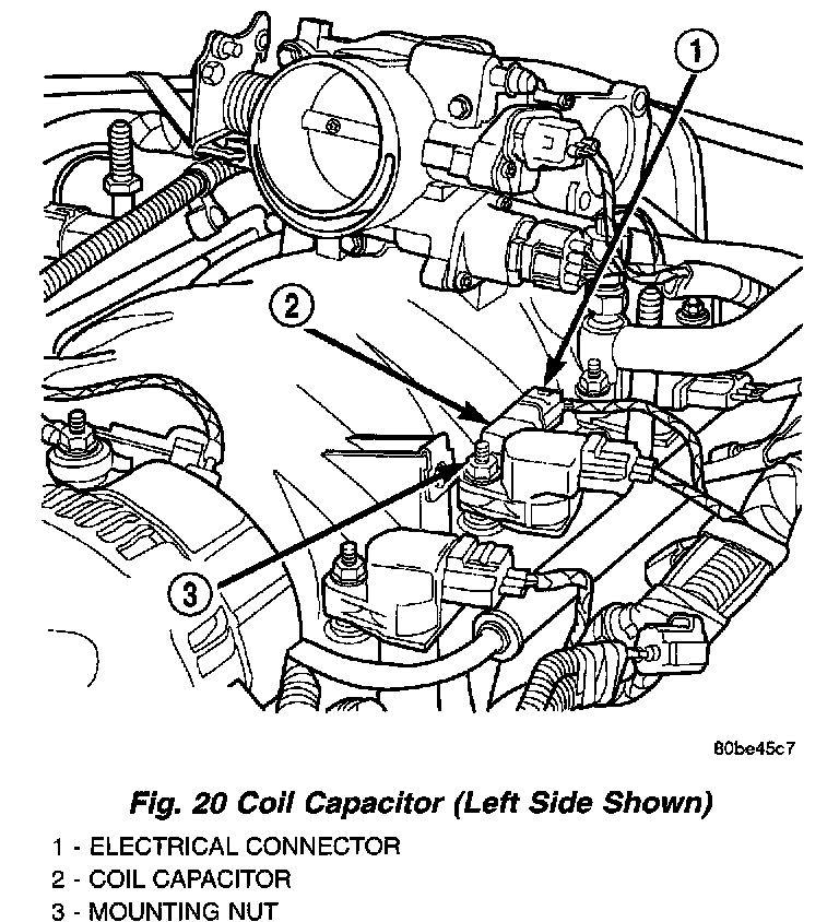 Two coil capacitors are used. One of them is located near the center of; and on the left side of the intake manifold. The other capacitor is located near the center of; and on the right side of the intake manifold.