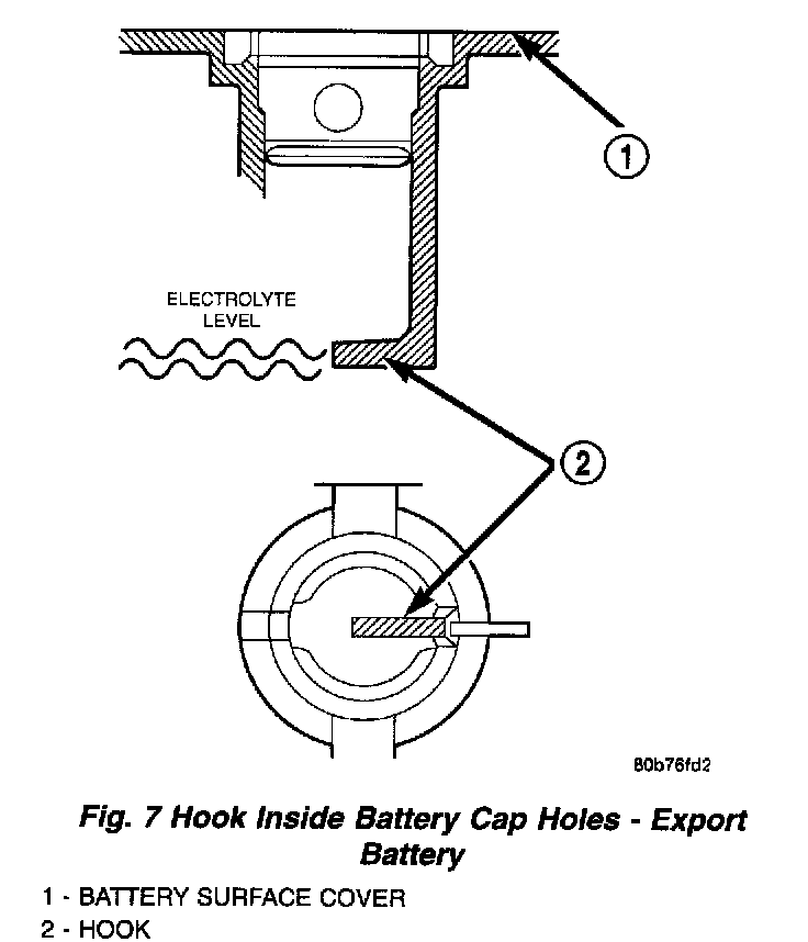 2. Look through the battery cap holes to determine the level of the electrolyte in the battery (Fig.7). The electrolyte should be approximately 1 centimeter above the battery plates or until the hook inside the battery cap holes is covered.