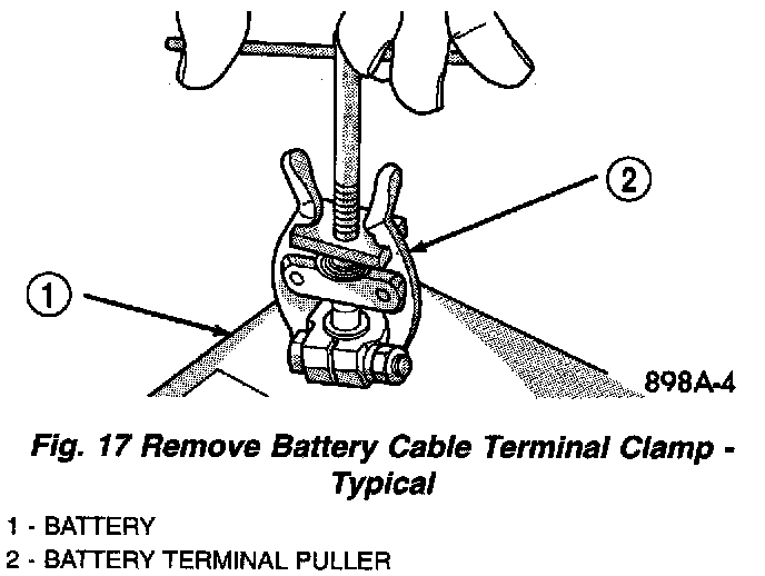 3. Disconnect the battery negative cable terminal clamp from the battery negative terminal post. If necessary, use a battery terminal puller to remove the terminal clamp from the battery post (Fig. 17).