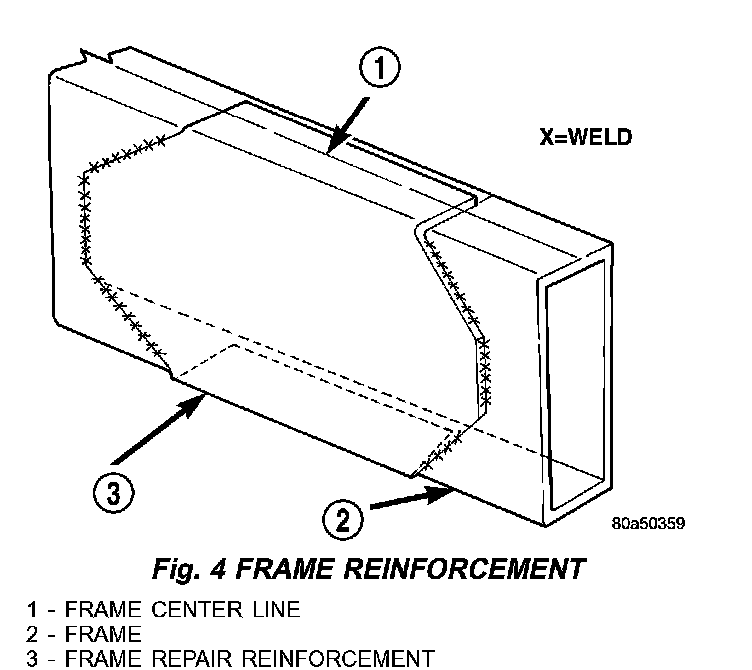 NOTE: If a reinforcement is required, it should completely cover the repaired area. The reinforcement should also overlap the top and bottom of the frame by more than 50% of its width. Weld as indicated (Fig. 4).