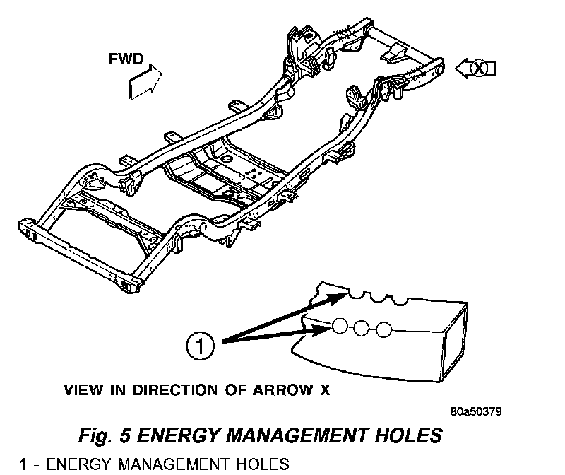 CAUTION: A reinforcement should never be used on the front section of the frame. The frame section forward of the suspension mounts contains energy management holes (Fig. 5). Reinforcing this area may effect energy management.