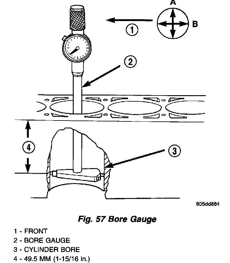 2. Measure the inside diameter of the cylinder bore at a point 49.5 mm (1-15/16 inches) below top of bore. Start perpendicular (across or at 90 degrees) to the axis of the crankshaft at point A and then take an additional bore reading 90 degrees to that at point B (Fig. 57).