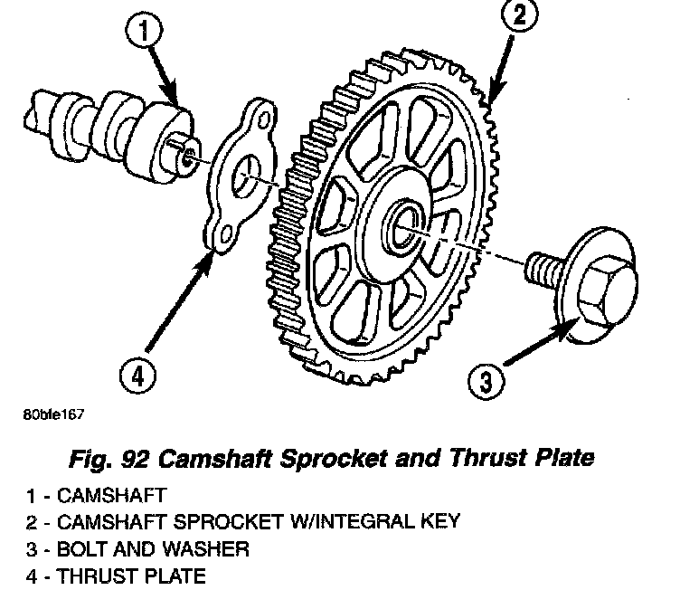 2. Install the camshaft sprocket bolt and washer (Fig. 92). Tighten the bolt to 68 Nm (50 ft. lbs.) torque.