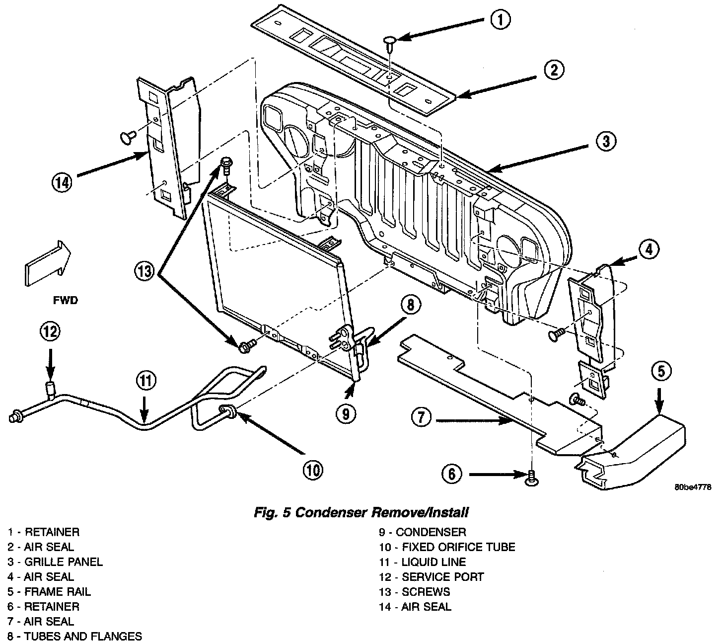 REMOVALCAUTION: Before removing the condenser, note the location of each of the radiator and condenser air seals. These seals are used to direct air through the condenser and radiator. The air seals must be reinstalled in their proper locations in order for the air conditioning and engine cooling systems to perform as designed.