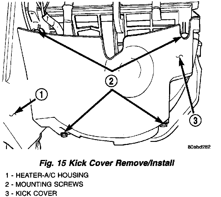 2. Loosen the two screws that secure the upper half of the kick cover to the heater-A/C housing under the passenger side end of the instrument panel.