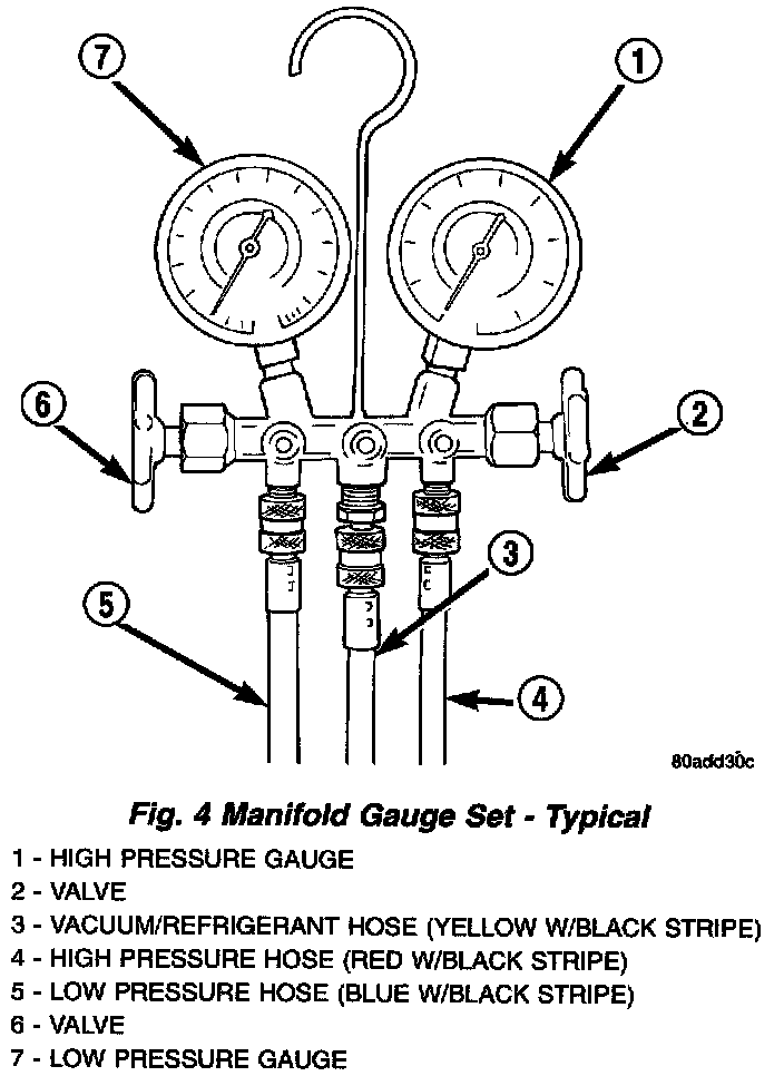 A manifold gauge set may be needed with some recovery/recycling(charging equipment. The service hoses on the gauge set being used should have manual (turn wheel), or automatic back-flow valves at the service port connector ends. This will prevent refrigerant from being released into the atmosphere.