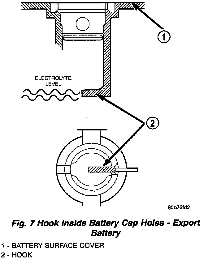 2. Look through the battery cap holes to determine the level of the electrolyte in the battery (Fig.7). The electrolyte should be approximately 1 centimeter above the battery plates or until the hook inside the battery cap holes is covered.