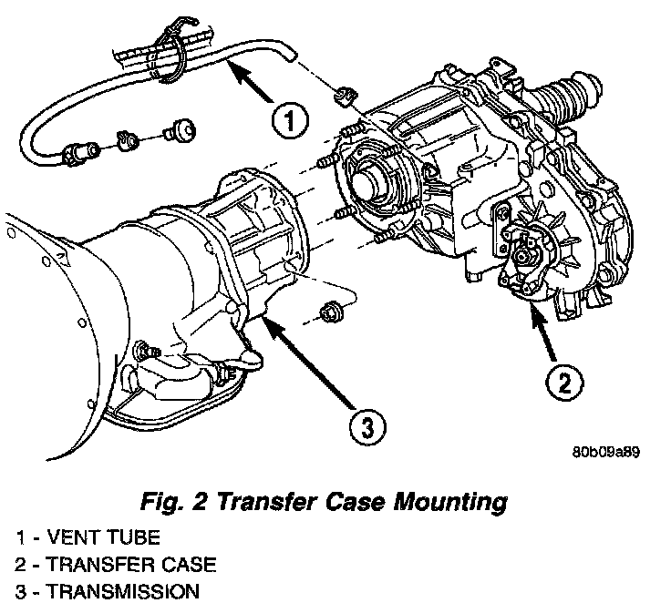 5. Install and tighten transfer case attaching nuts to 35 Nm (26 ft. lbs.) torque (Fig. 2).
