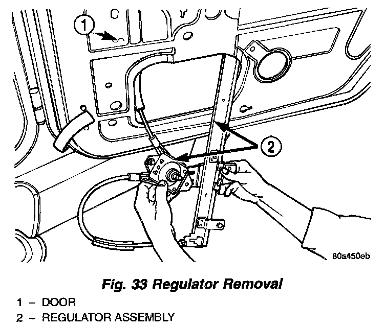 4. Lift the regulator upward to free it from the slotted holes in the door inner panel.