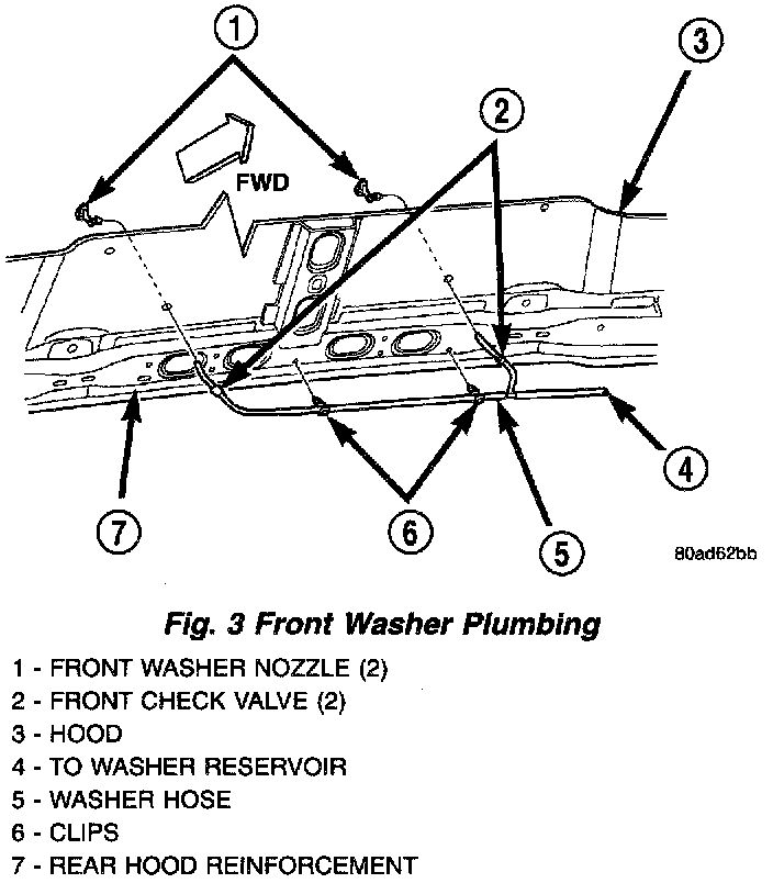 2. Locate the front check valve in the washer supply hose for each front washer nozzle. A check valve is installed between the molded plastic tee fitting and each nozzle near the rear hood panel reinforcement.