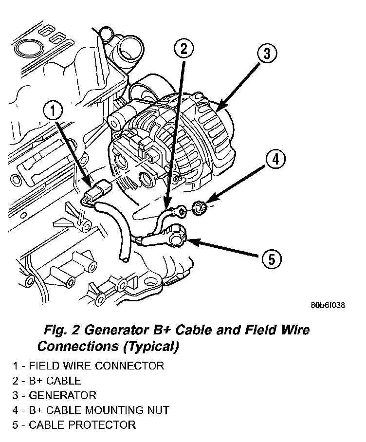 Fig.2 Generator B+ Cable And Field Wire Connections (Typical - 4.0L Engine Shown):