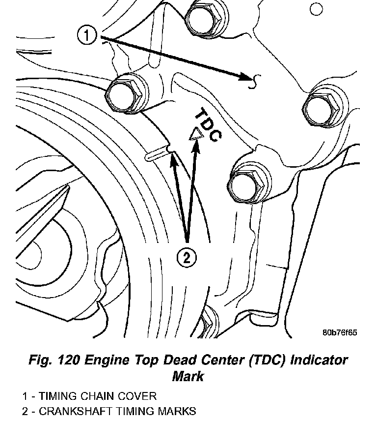 5. Rotate engine until timing mark on crankshaft damper aligns with TDC mark on timing chain cover (Fig. 120) (# 1 cylinder exhaust stroke) and the camshaft sprocket "V8" marks are at the 12 o'clock position (Fig. 121).
