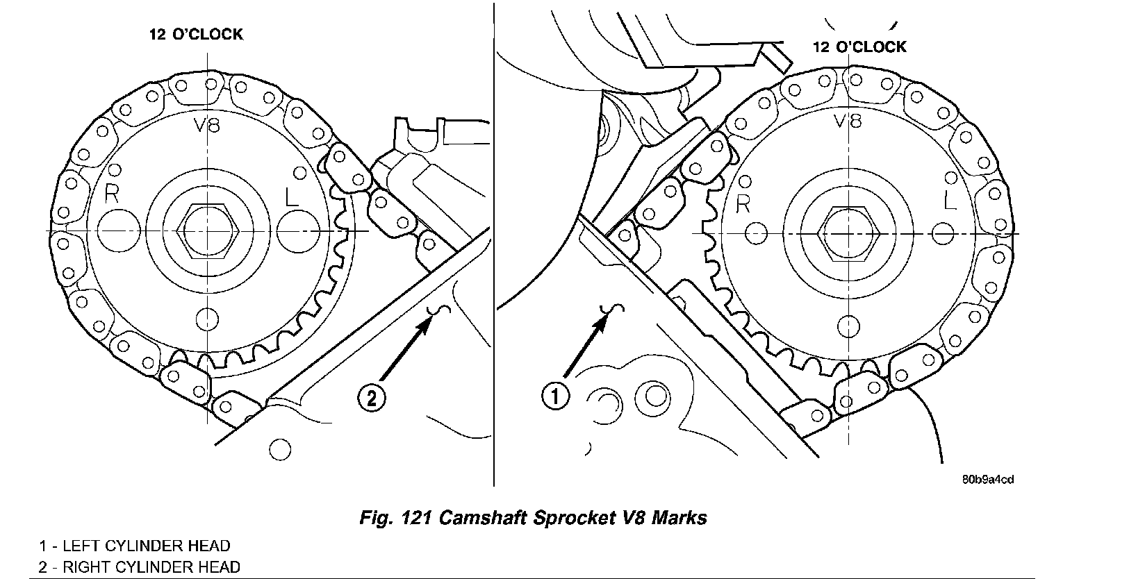 ^ secondary chain camshaft sprockets "V8" marks are at 12 o'clock (Fig. 127)