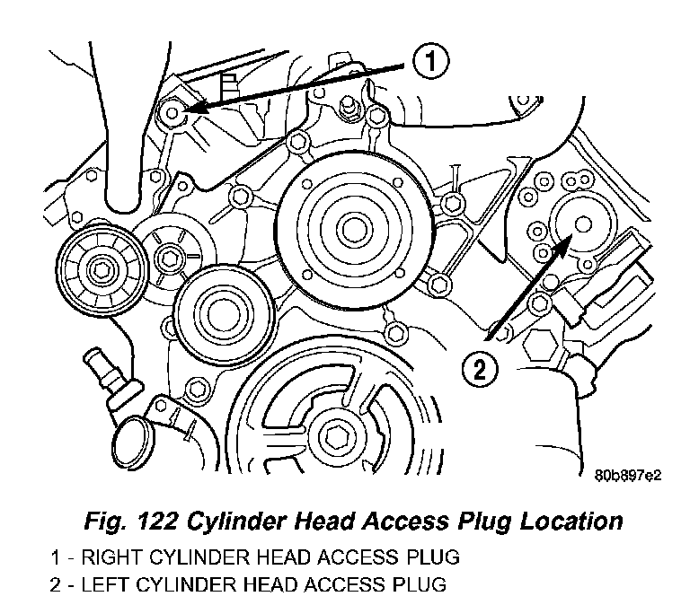 7. Remove access plugs (2) from left and right cylinder heads for access to chain guide fasteners (Fig. 122).