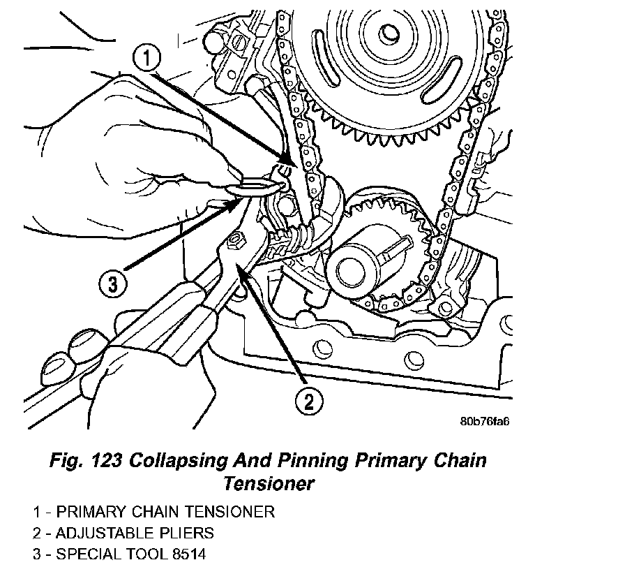 10. Collapse and pin primary chain tensioner (Fig. 123).