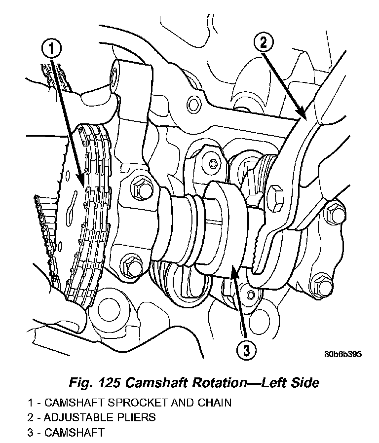 14. While holding the left camshaft steel tube with adjustable pliers, (Fig. 125) remove the left camshaft sprocket. Slowly rotate the camshaft approximately 15 degrees clockwise to a neutral position.