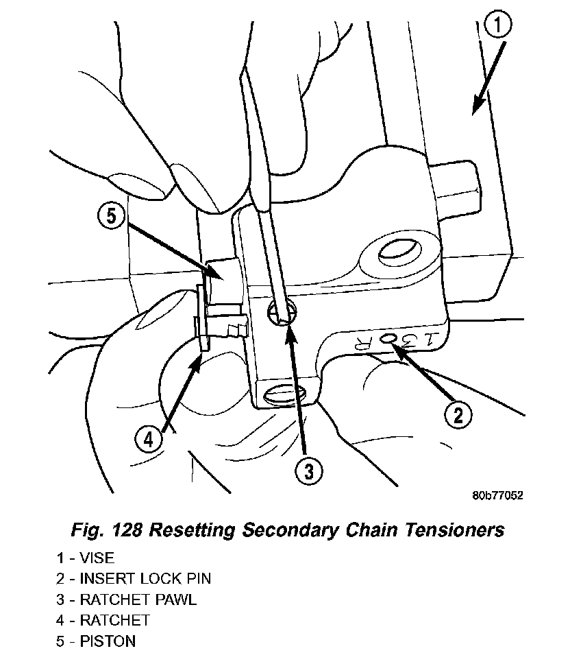 1. Using a vise, lightly compress the secondary chain tensioner piston until the piston step is flush with the tensioner body. Using a pin or suitable tool, release ratchet pawl by pulling pawl back against spring force through access hole on side of tensioner. While continuing to hold pawl back, Push ratchet device to approximately 2 mm from the tensioner body. Install Special Tool 8514 lock pin into hole on front of tensioner. Slowly open vise to transfer piston spring force to lock pin (Fig. 128).