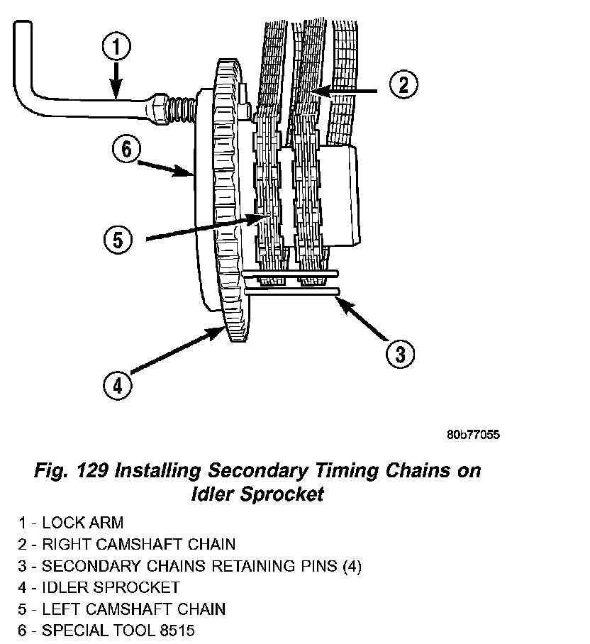 7. Install both secondary chains onto the idler sprocket. Align two plated links on the secondary chains to be visible through the two lower openings on the idler sprocket (4 o'clock and 8 o'clock). Once the secondary timing chains are installed, position special tool 8515 to hold chains in place for installation (Fig. 129).