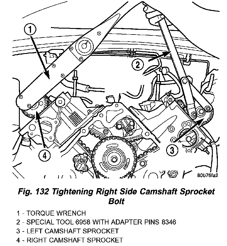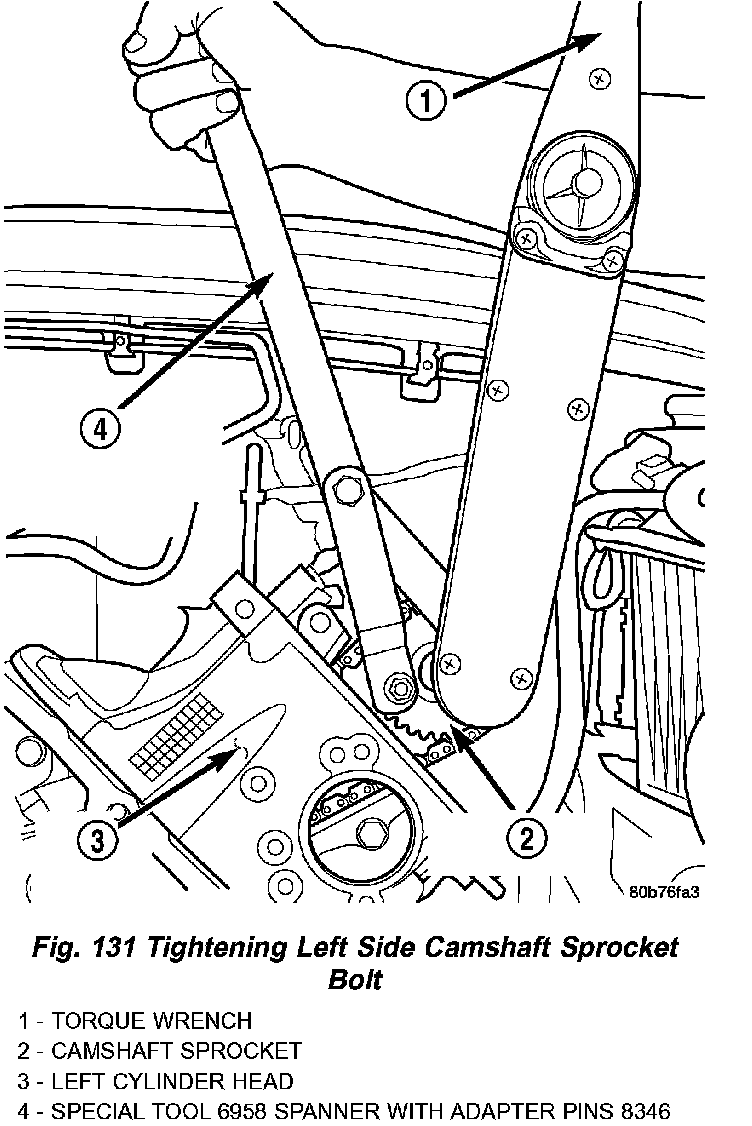 18. Using Special Tool 6958, Spanner with Adaptor Pins 8346, tighten left (Fig. 131) and right (Fig. 132). Camshaft sprocket bolts to 122 Nm (90 ft. lbs.).