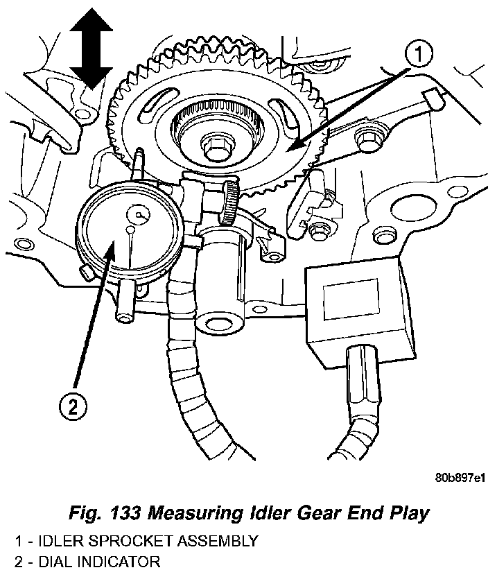 21. After installing all chains, it is recommended that the idler gear end play be checked (Fig. 133). The end play must be within 0.10 - 0.25 mm (0.004 - 0.010 in.). If not within specification, the idler gear must be replaced.
