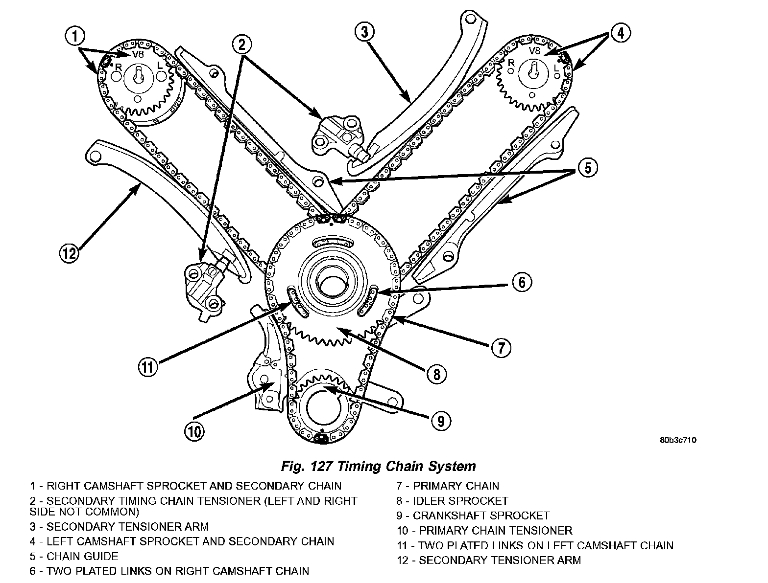 14. Verify that all plated links are aligned with the marks on all sprockets and the "V8" marks on camshaft sprockets are at the 12 o'clock position (Fig. 127).
