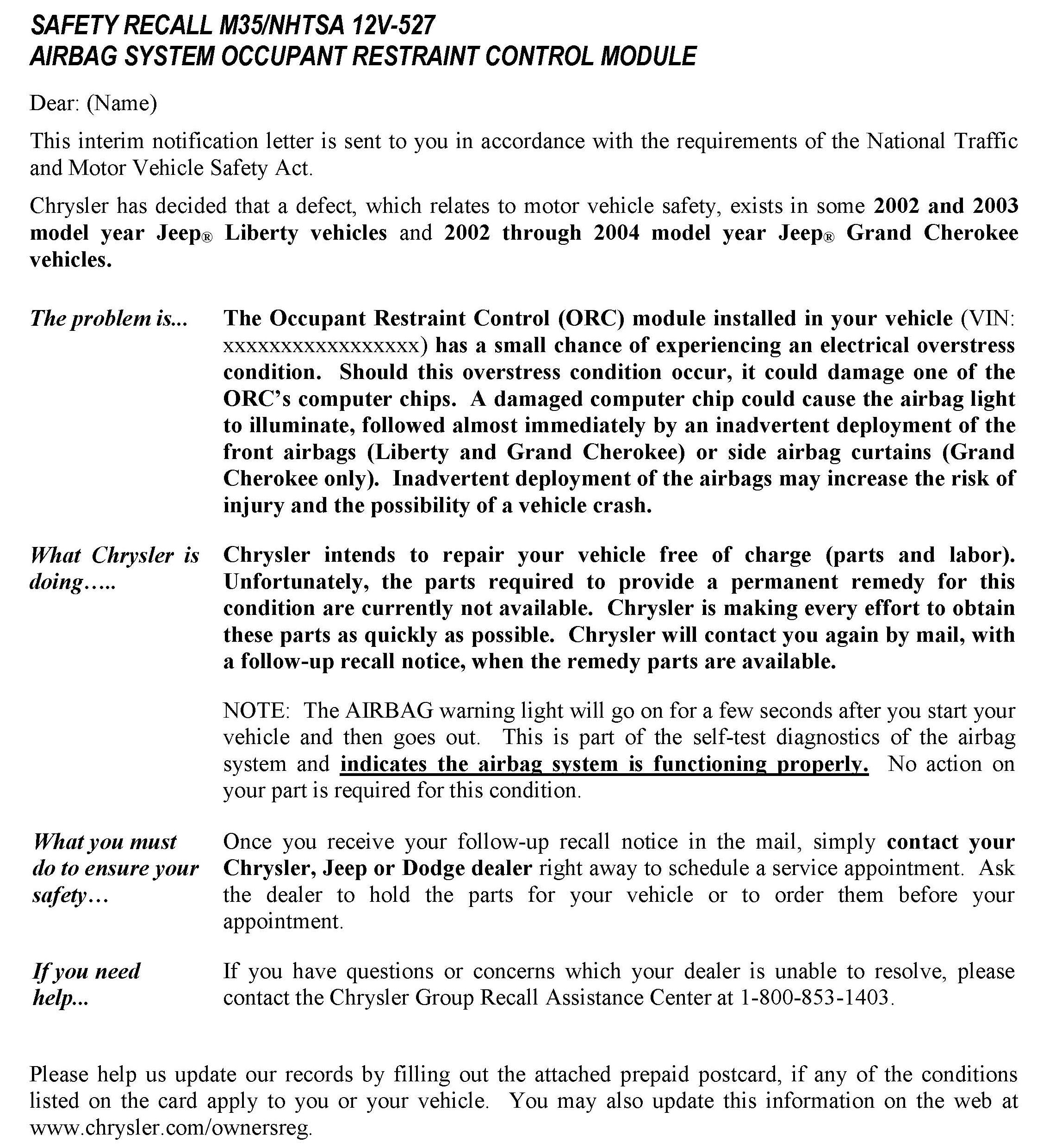 Recall - Occupant Restraint Control Module