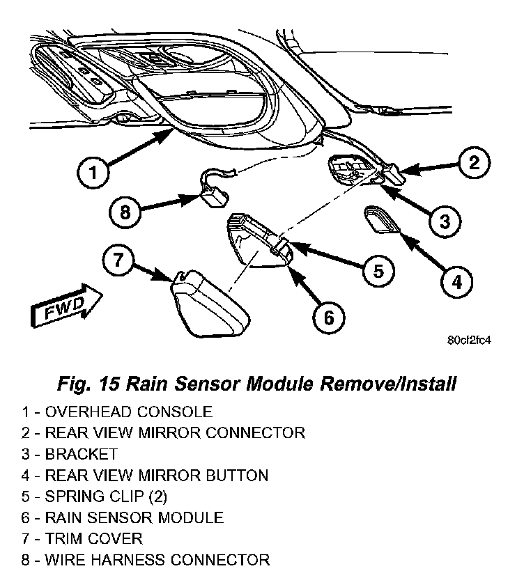 2. Adjust the inside rear view mirror on the windshield downward far enough to access the lower edge of the Rain Sensor Module (RSM) trim cover.