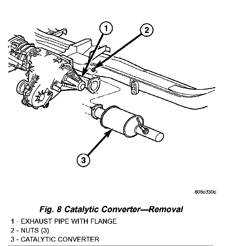 1. Position the catalytic converter onto the exhaust pipe flange connection. Tighten the nuts to 28 Nm (250 in. lbs.) torque.
