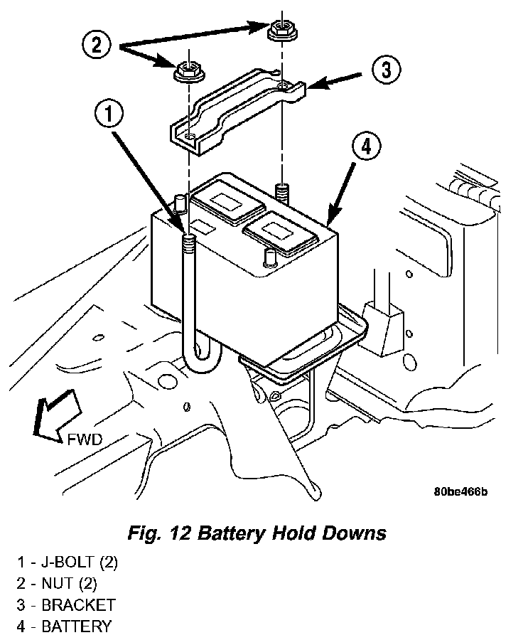 The battery hold down hardware (Fig. 12) includes two J-bolts, a hold down bracket and two hex nuts with coned washers. The battery hold down bracket consists of a stamped steel bracket that is then plastic-coated for corrosion protection.