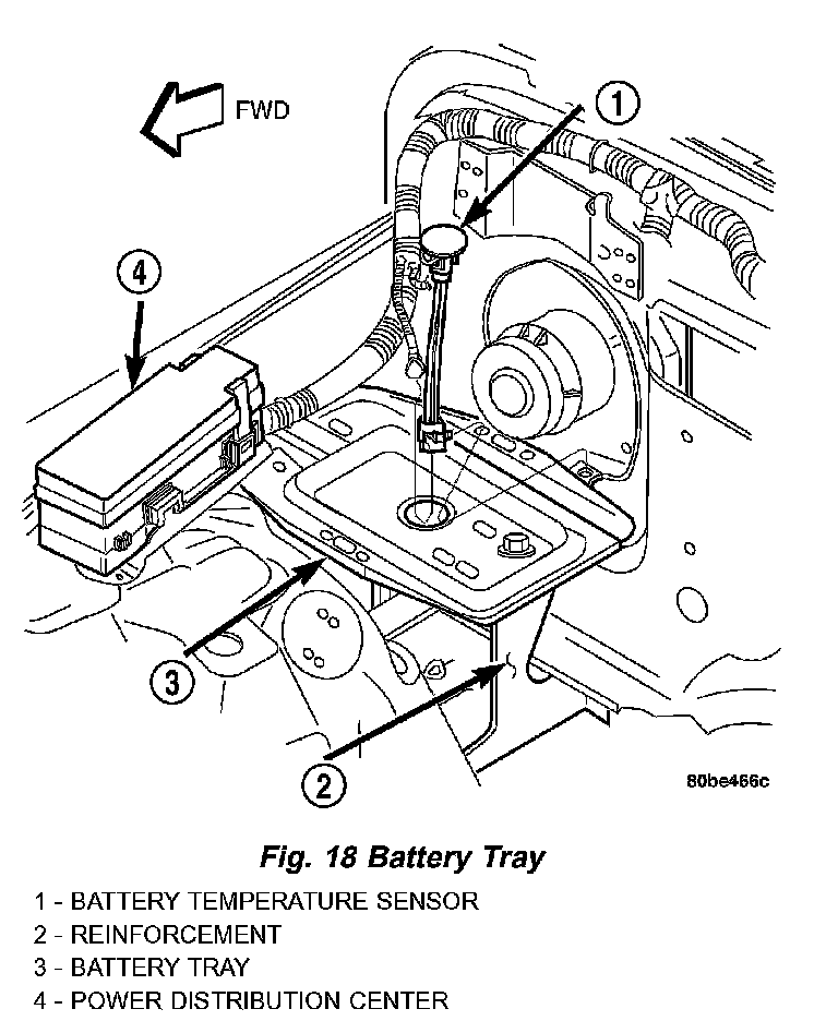 The battery is mounted in a stamped steel tray (Fig. 18) located in the passenger side rear corner of the engine compartment. The battery tray is secured by four hex screws with washers to the reinforcement located between the engine compartment side of the dash panel and the rear of the front fender wheelhouse inner panel.