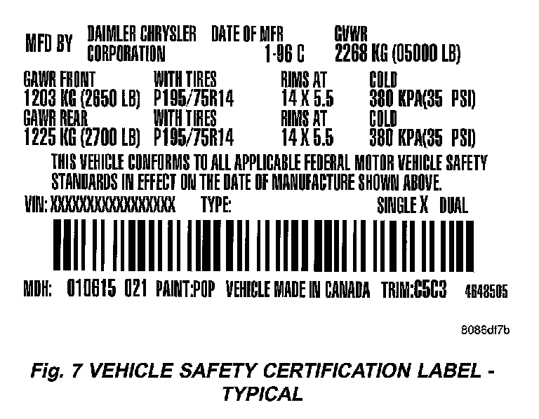 A vehicle safety certification label (Fig. 7) is attached to every Daimlerchrysler Corporation vehicle. The label certifies that the vehicle conforms to all applicable Federal Motor Vehicle Safety Standards. The label also lists: