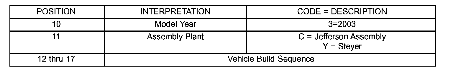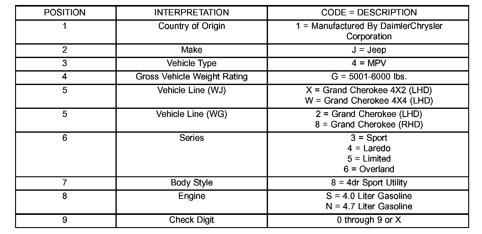 The Vehicle Identification Number (VIN) plate is attached to the top left side of the instrument panel. The VIN contains 17 characters that provide data concerning the vehicle. Refer to the decoding chart to determine the identification of a vehicle.