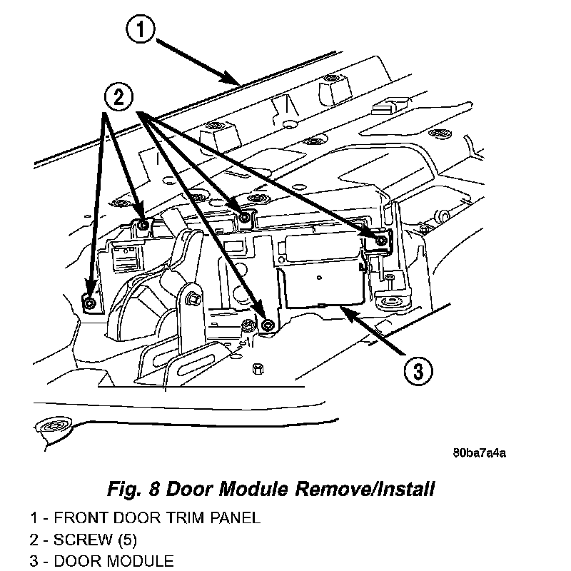 2. Install the door module to the back of the front door trim panel. Tighten the screws to 2.2 Nm (20 in. lbs.).