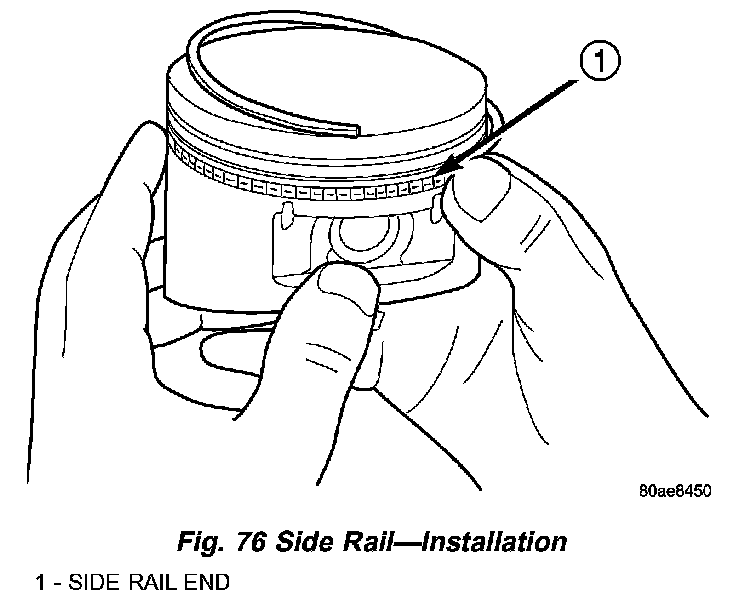 9. Install upper side rail (Fig. 76) by placing one end between the piston ring groove and the expander ring. Hold end firmly and press down the portion to be installed until side rail is in position. Repeat this step for the lower side rail.